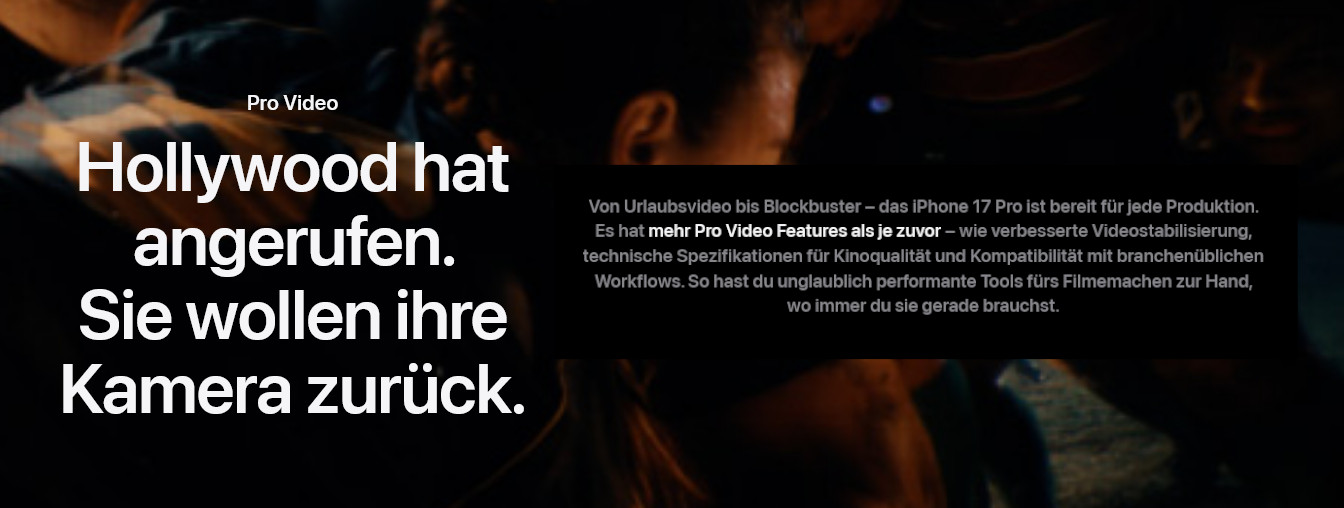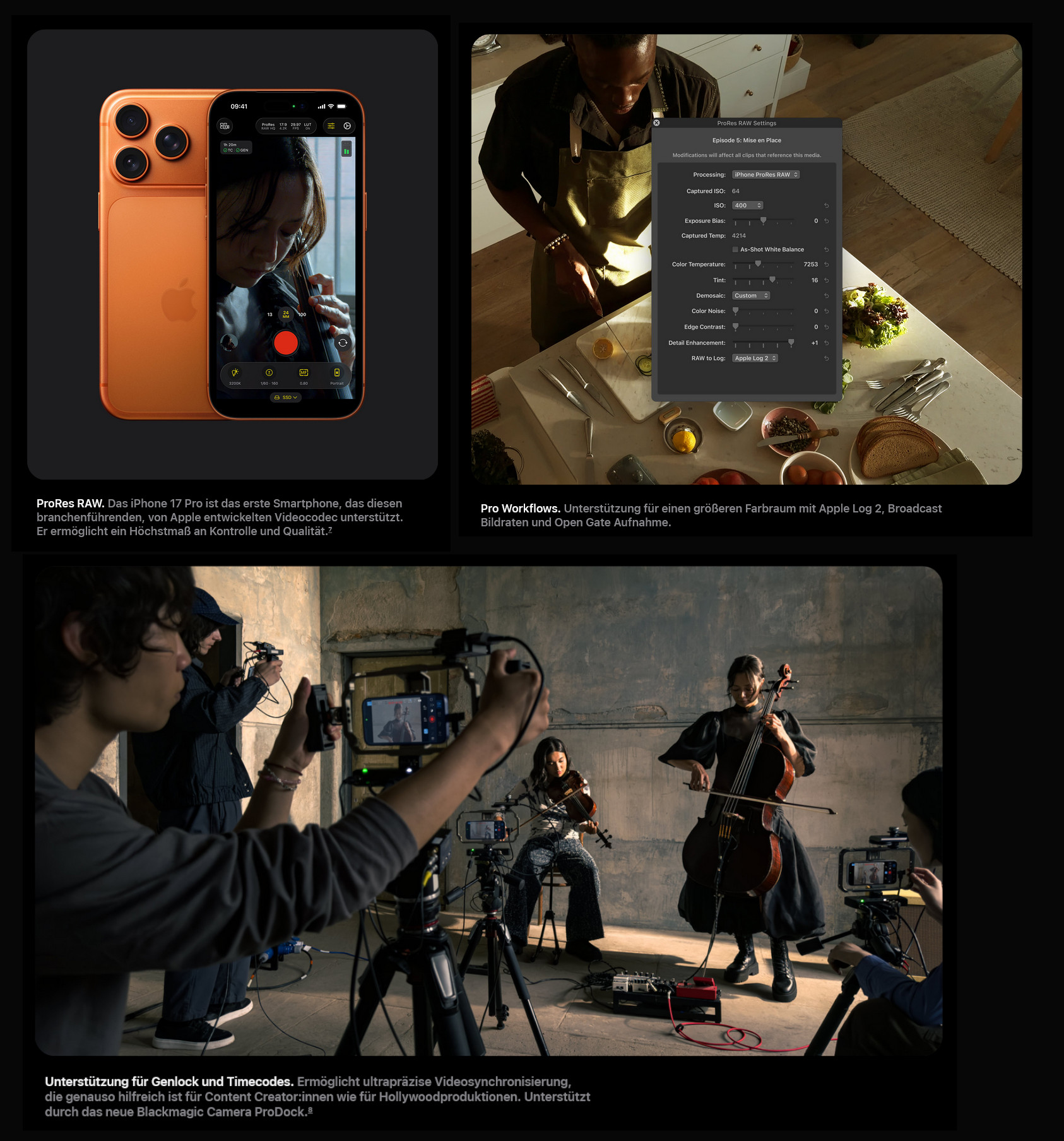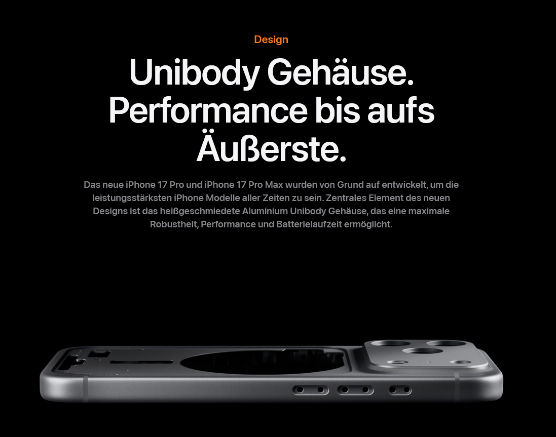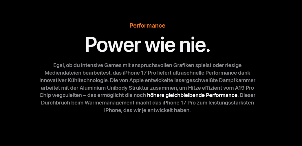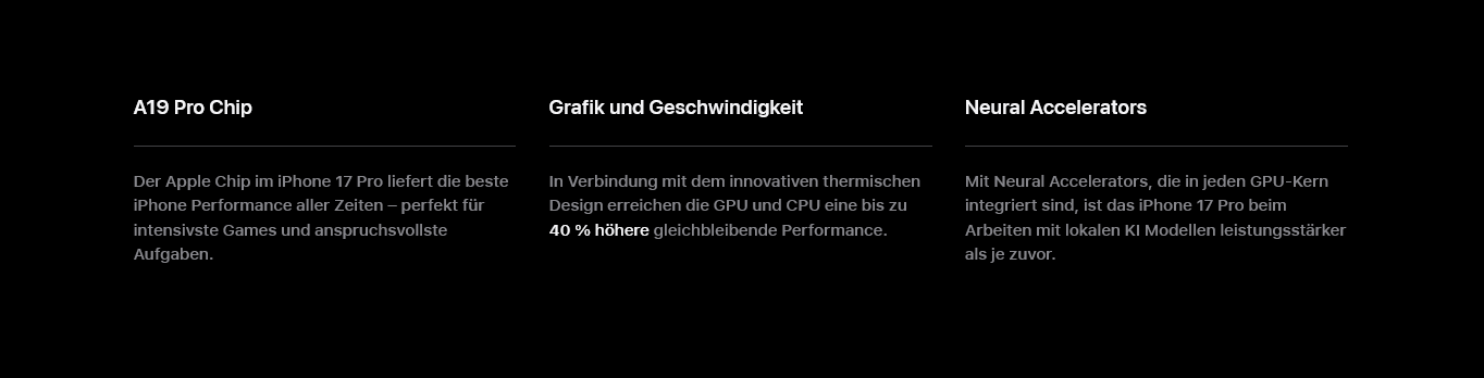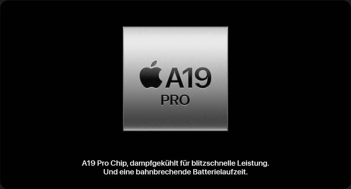 | Chip | A19 Pro Chip 6‑Core CPU mit 2 Performance-Kernen und 4 Effizienz-Kernen 6‑Core GPU mit Neural Accelerators 16‑Core Neural Engine Hardware beschleunigtes Raytracing | |