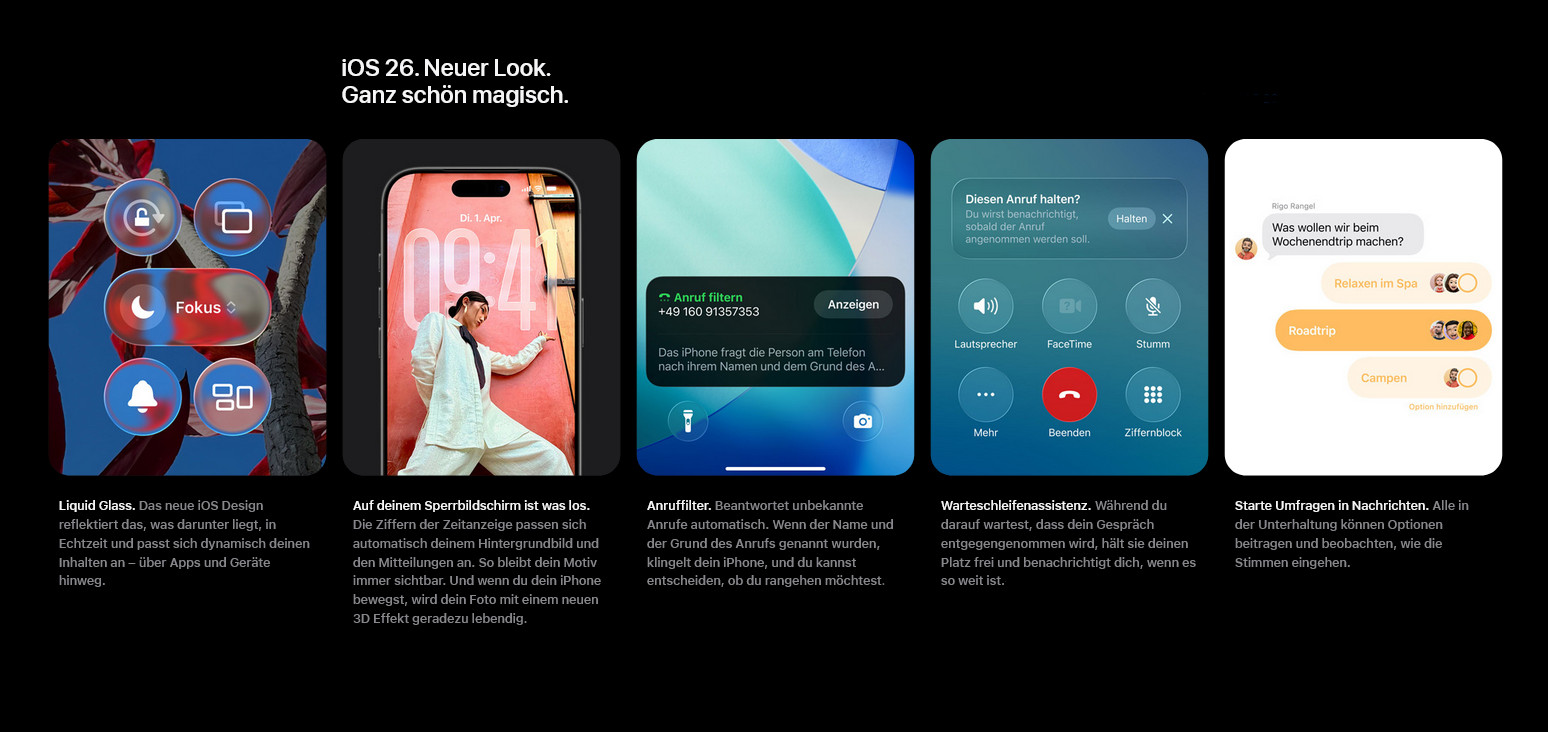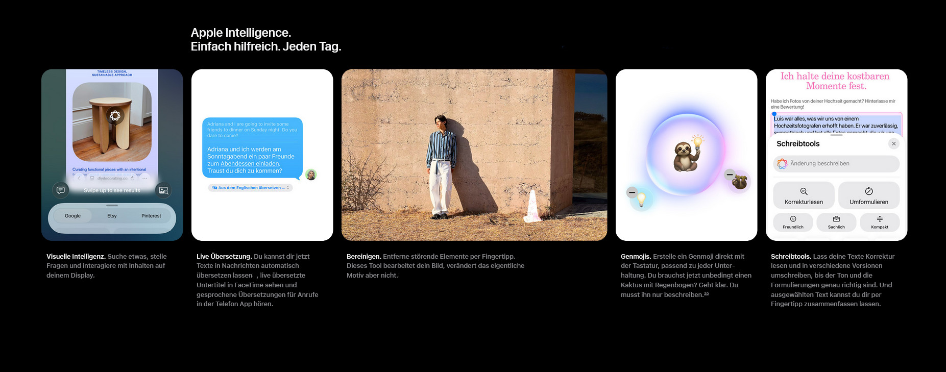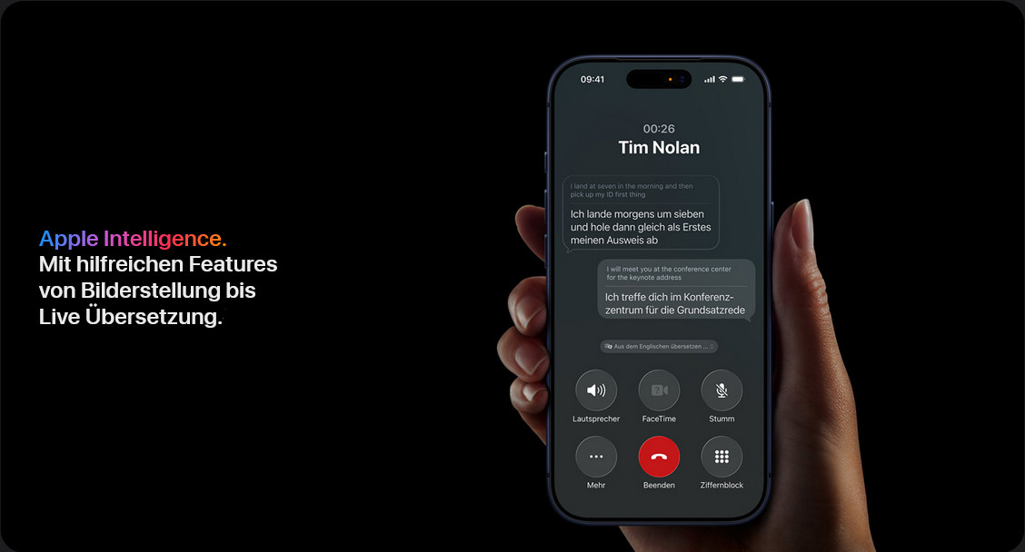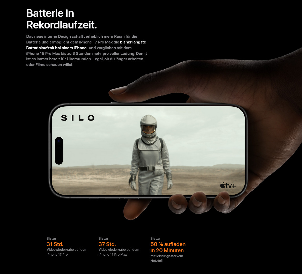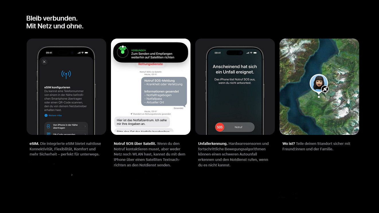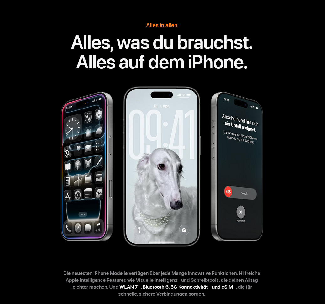 | Drahtlose Technologien | 5G (sub‑6 GHz) mit 4x4 MIMO Gigabit LTE mit 4x4 MIMO Apple N1 Chip für drahtlose Netzwerke WLAN 7 (802.11be) mit 2x2 MIMO Bluetooth 6 Thread Netzwerk-Technologie Apple Ultrabreitband-Chip der 2. Generation NFC mit Lesemodus Express Cards mit Energiereserve | |