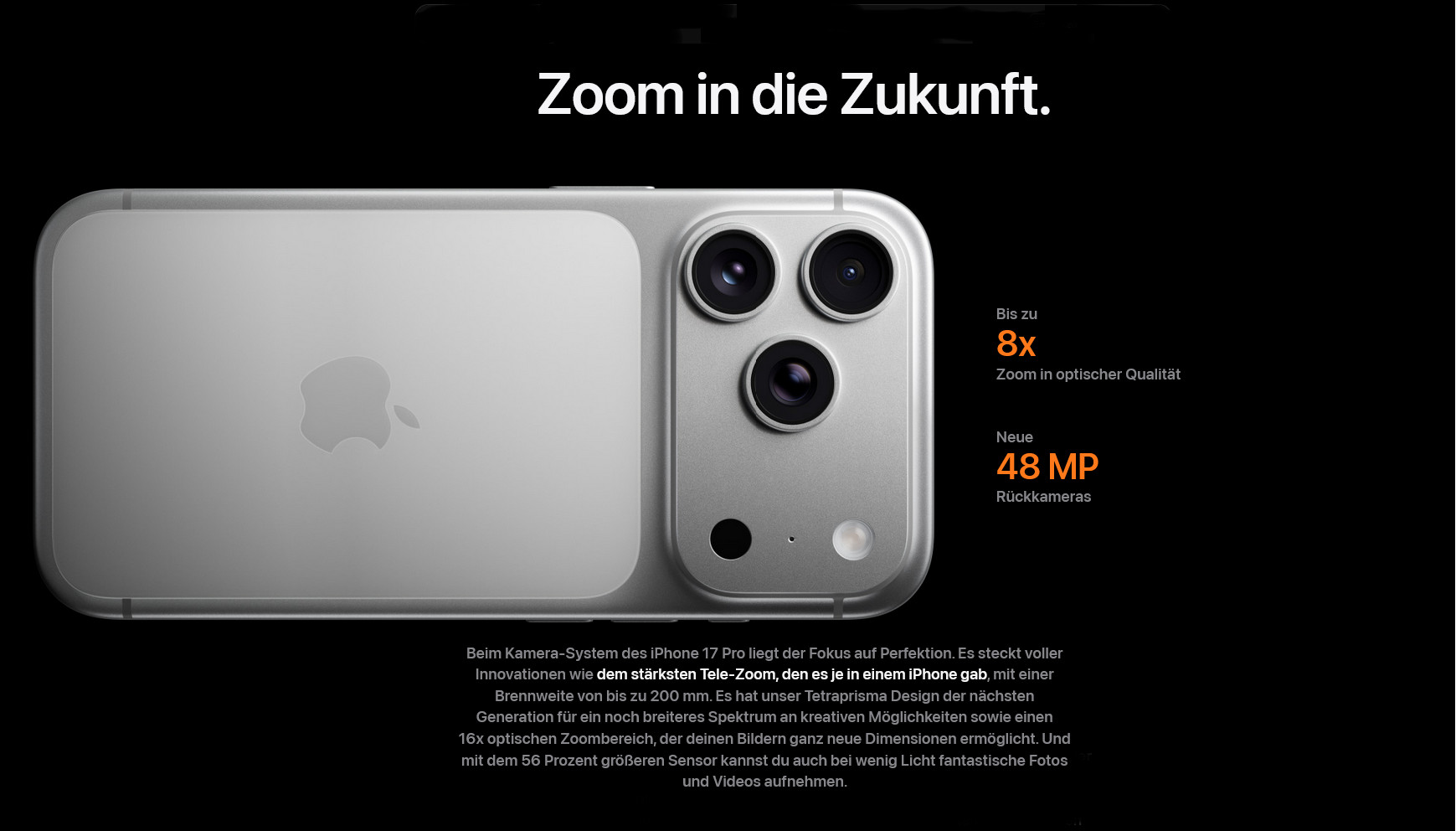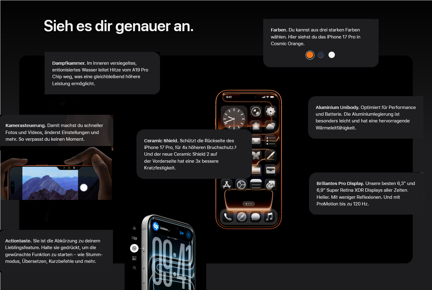 | Beschreibung | Apple iPhone Pro 17, Tiefblau, 256 GB, 5G (sub‑6 GHz) mit 4x4 MIMO, Smartphone - Dual-SIM, MG8J4ZD/A | |