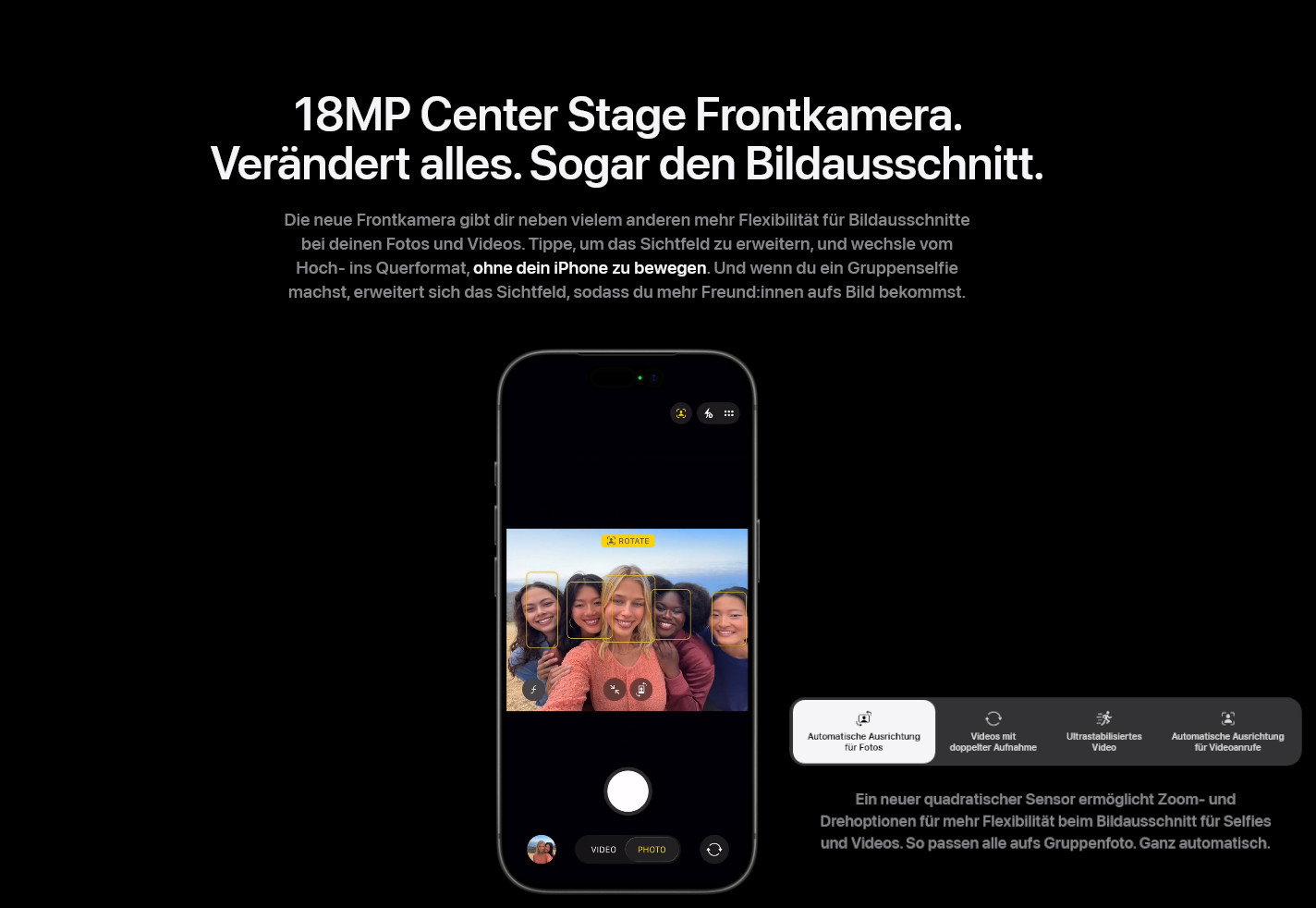 | Frontkamera | 18MP Center Stage Kamera ƒ/1.9 Blende | |